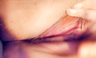 Extreme closeup gash gobbling, her fat hairy cunt is so tasty, she moves her red undies aside and cums