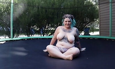 Fat Tatted Milf Jumping and Stripping on a Trampoline